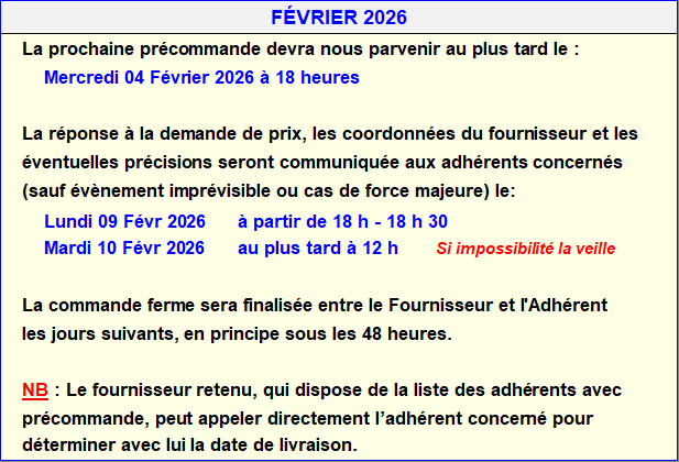 La clôture mensuelle des précommandes a lieu le 1er mercredi du mois à 18 h.